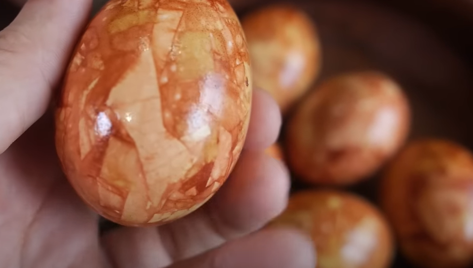 У каструлю з відваром треба покласти підготовлені яйця й варити кілька хвилин. Після охолодження крашанки розпаковують і промивають. У підсумку виходить м"який мармуровий ефект з оранжевими переливами.
