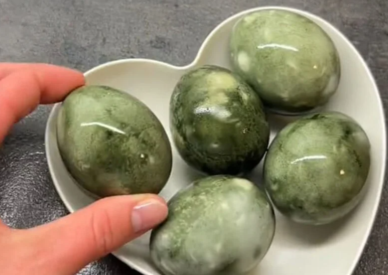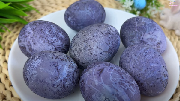 Чим довше яйце настоюється, тим інтенсивнішим буде синюватий відтінок. Після цього плівку знімають, залишки чаю змивають, а самі яйця натирають олією для блиску. Отриманий результат – глибокий мармуровий синій з природними переходами.