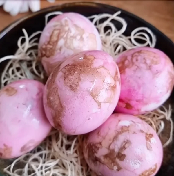 Інгредієнти доводять до кипіння, в отриманому відварі варять яйця, а потім залишають у настої на кілька годин. Завдяки поєднанню каркаде й куркуми шкаралупа набуває природних мармурових переливів. На завершення їх можна натерти олією, щоб надати блиску.