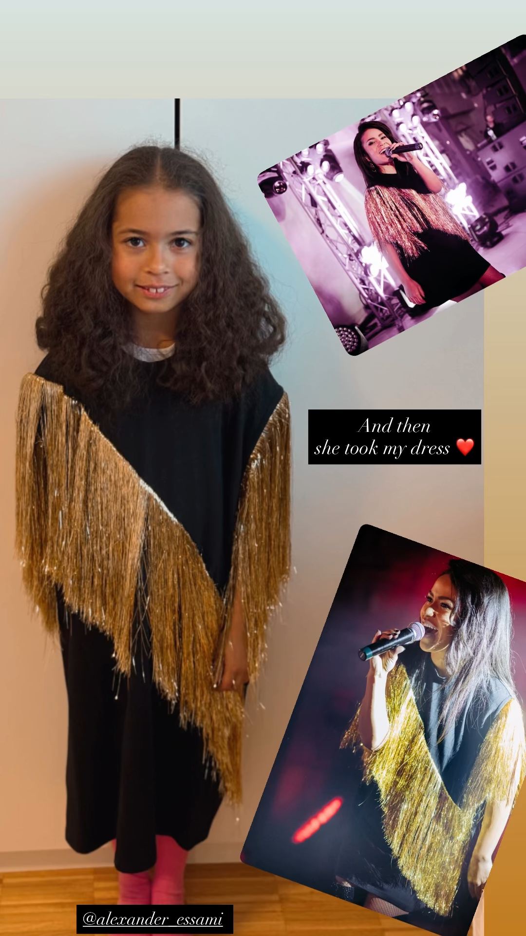 Дитина, як і всі дівчатка у такому віці, любить модничати в одязі своєї мами. Цього разу Сапфір-Ніколь "віджала" У Гайтани чорну сукню з золотистою бахромою.