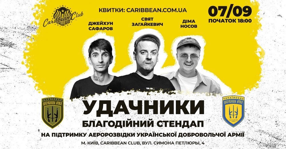 Три талановитих коміки підготували свої найкращі жарти для цього вечора, щоб зарядити вас позитивною енергією, а також зібрати кошти на підтримку аеророзвідки Української Добровольчої Армії. Кожного дня хлопці та дівчата з цього підрозділу створюють чимало проблем для окупантів – літають над їхніми позиціями, скидують з дронів вибухівку, коригують артилерію та працюють дронами камікадзе. Сьогодні цей підрозділ потребує підтримки, щоб кожен їхній наступний удар був ще точнішим та смертоноснішим. Тож 7 вересня Caribbean Club запрошує долучитися до важливої справи та послухати: