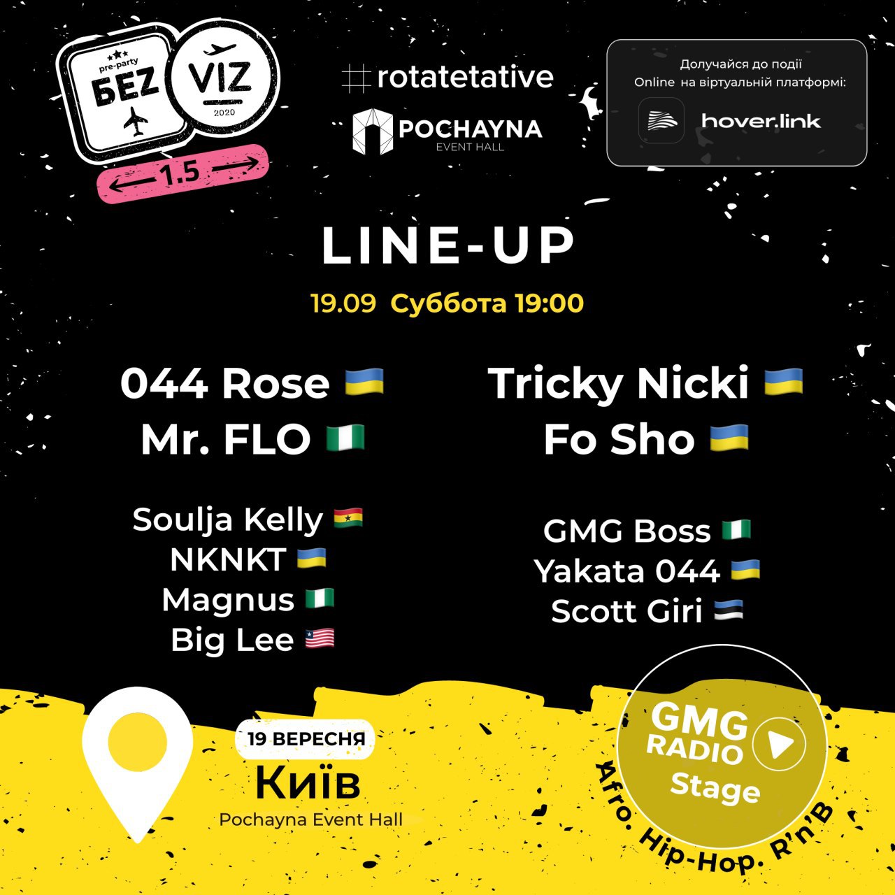 Хедлайнерами "БеZVIZ Pre-party 1.5" стануть популярні зірки всеукраїнського та міжнародного рівня: Onuka, "Ляпис-98", O.Torvald та Karna. Також на фестивалі виступлять гурти "Гражданин Топинамбур", "Сметана Band", 044 Rose, Fo Sho та багато інших.