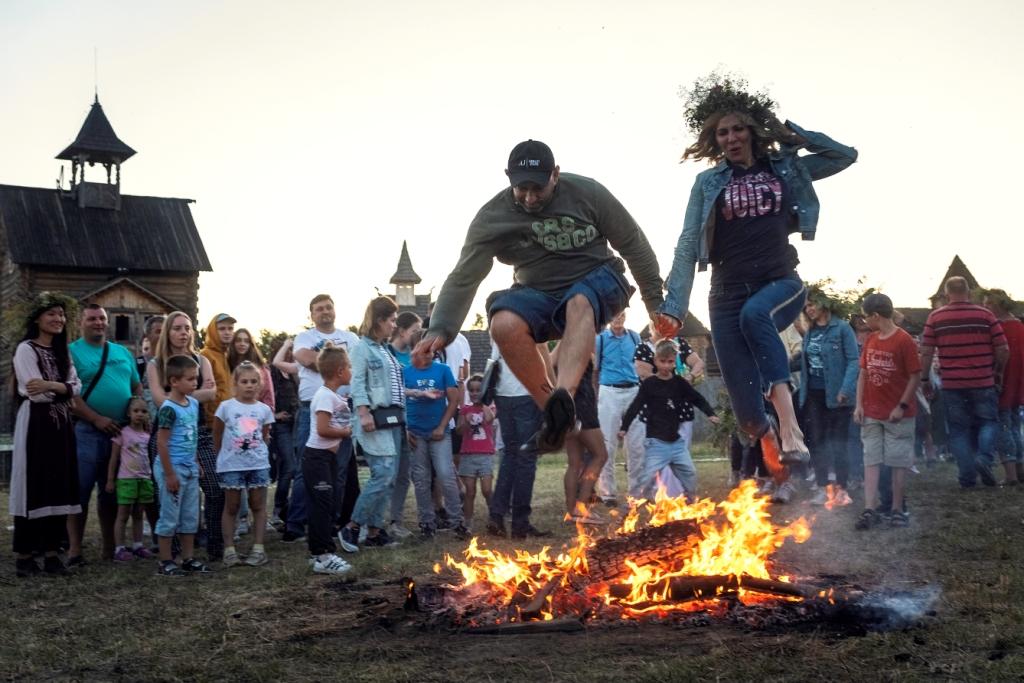 Вечірня програма буде запальною, в прямому сенсі слова! З настанням сутінків у Древньому Києві запалять вогнища. Тож гості зможуть спалити негатив і оновитися, стрибнувши через багаття – по одному або по парах, якщо хочуть знайти своє кохання, або вийти заміж чи одружитися. Кульмінацією вогняної феєрії стане спалювання купальського опудала. З цією великою солом'яною лялькою згорять всі негаразди, а веселі хороводи навколо багаття нададуть небувалого заряду позитиву.