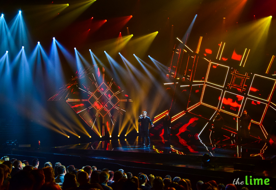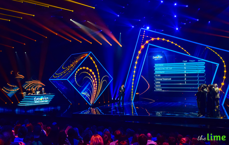 22:03 - Сергій Притула викликав на сцену вісьмох учасників ІІ етапу Національного відбору, щоб зачитати їм оцінки суддів.
