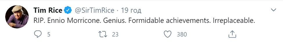 "Енніо Морріконе. Геній. Блискучі досягнення. Незамінний", - коротко відреагував на новину про смерть колеги драматург Тім Райс.