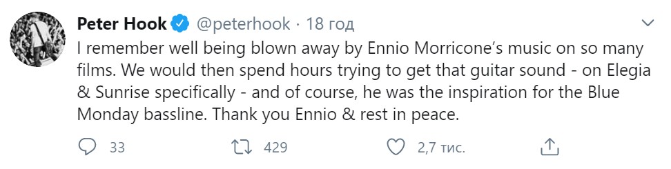 "Я добре пам'ятаю, як мене вразила музика Енніо Морріконе в багатьох фільмах. Потім ми годинами намагалися отримати подібний гітарний звук [...] Дякую, Еніо. Спочивай з миром" (Пітер Хук, Joy Division).