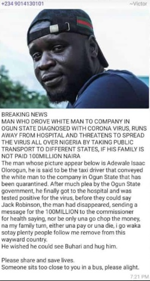 Незабаром після того, як в Нігерії був зареєстрований перший випадок захворювання, невідомий автор розповів у мережі історію про чорношкірого хлопця, якому діагностували Covid-19. При цьому він нібито втік з ізоляції і вимагає у місцевого уряду гроші, погрожуючи навмисне поширювати хворобу. До історії прикріпили фотографію Джудо, і тепер хлопець не знає, як йому бути. Адже люди готові його четвертувати.