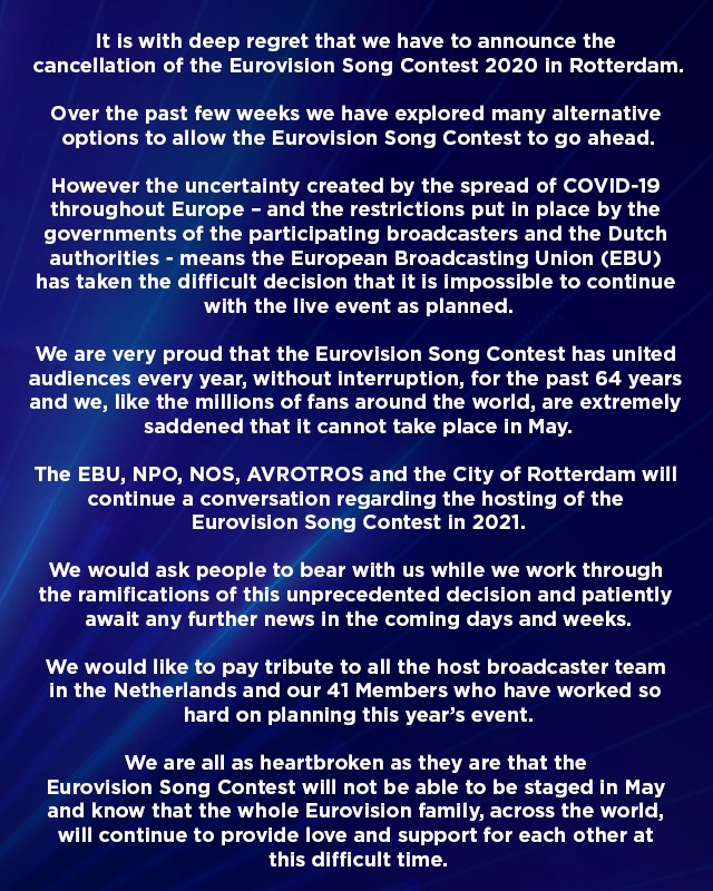Згідно з повідомленням EBU, пісенний конкурс переноситься на наступну весну без зміни країни та міста - Євробачення 2021 відбудеться в Роттердамі.