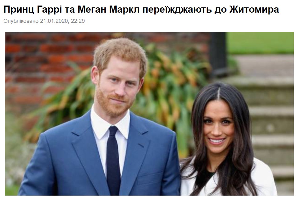 Так, на цьому тижні в мережі з'явилася інформація, що принц Гаррі і Меган Маркл мріють оселитися в Житомирі. Як пише портал сатиричних новин UAReview, нібито це і стало приводом відокремитися від королівської родини. Наслідуючи манеру видань, жартівники посилаються на "особисті джерела" в Букінгемському палаці.