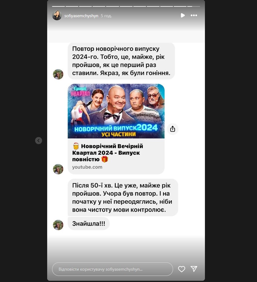 Скрини зі сценки "Кварталу 95" Семчишин опублікувала на своїй сторінці в Інстаграмі вночі 31 грудня 2024 року.