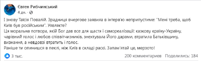 "Ця моральна потвора, якій Бог дав усе для щастя й самореалізації: казкову країну – Україну, чарівний голос і любов співвітчизників, – знехтувала його дарами, втратила Батьківщину, визнання, а невдовзі втратить і голос. Раніше ти опинишся в пеклі, ніж Київ – у складі Расєї. Запам'ятай це, мерзото!" - наголосив Рибчинський.