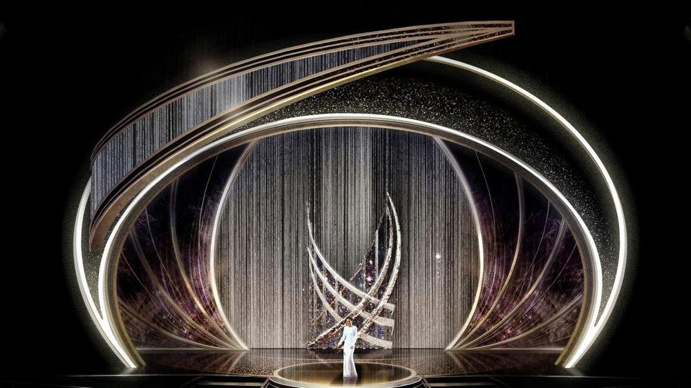 03:05 Так цього року виглядає сцена церемонії "Оскар". Висота головної конструкції складає 11,5 м, вага - близько 500 кг. Для її оформлення використовували 40 тис. кристалів Swarovski.
