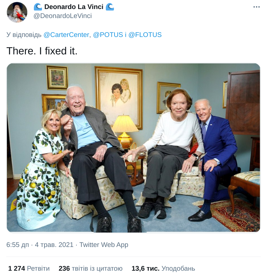 Фото зробили 29 квітня у містечку Плейнс, де найстарший американський президент в історії Джиммі Картер (96 років) живе зі своєю дружиною Розалін (93 роки). На ньому Картери сидять у кріслах, а Байдени стоять поруч на колінах, демонструючи вражаючу різницю в розмірах.