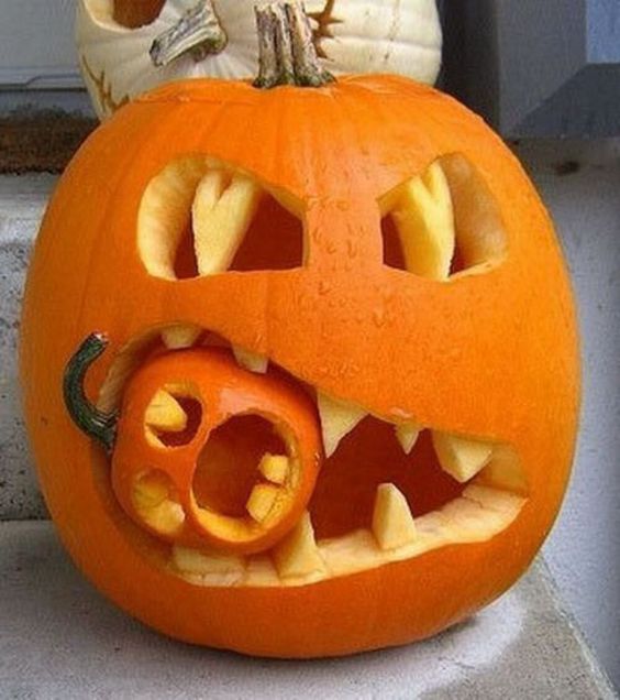 Також можна вирізати в одному гарбузі отвір, в який помістити другий гарбуз з малюнком, наприклад, величезного ока.