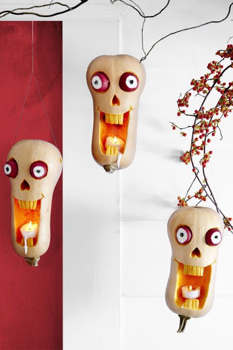 З довгастих гарбузів можна створити незвичні світильники у вигляді голови скелета. Правда, щоб вирізати такий шедевр знадобиться набагато більше часу і, природно, досвіду.