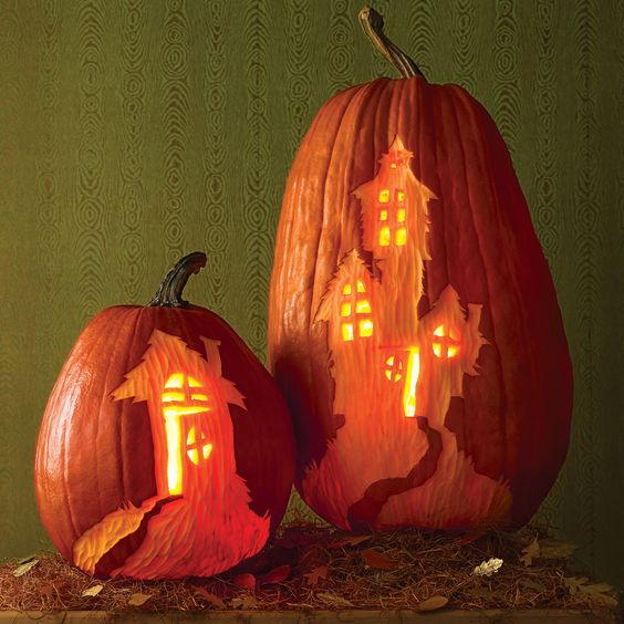 Той, хто вже має досвід вирізання, може зробити цілу композицію з двох гарбузів різного розміру.