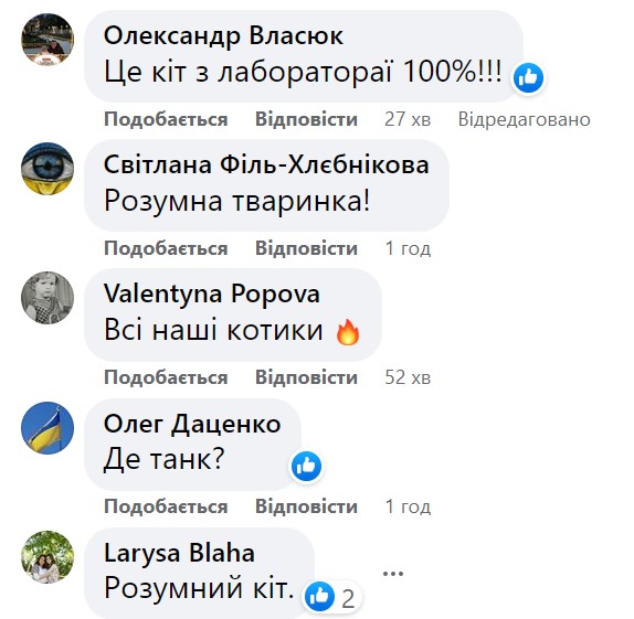 "Оце моє улюблене відео! Котяче ТРО", "В Україні навіть коти демонструють своє ставлення до росії", "Наступні новини в оркостані: українці в біологічних лабораторіях готують котів до наступу на раzzєю", "Кіт вирішив, що це єдине, для чого можна використати рашистський танк", "Кота, мабуть, звуть Степан", "Наш Мурчик молодець", "Який розумний котик! Знає, що робити на рашистському танку", "Коти розумніші за орків", - висловилися користувачі мережі з цього приводу.