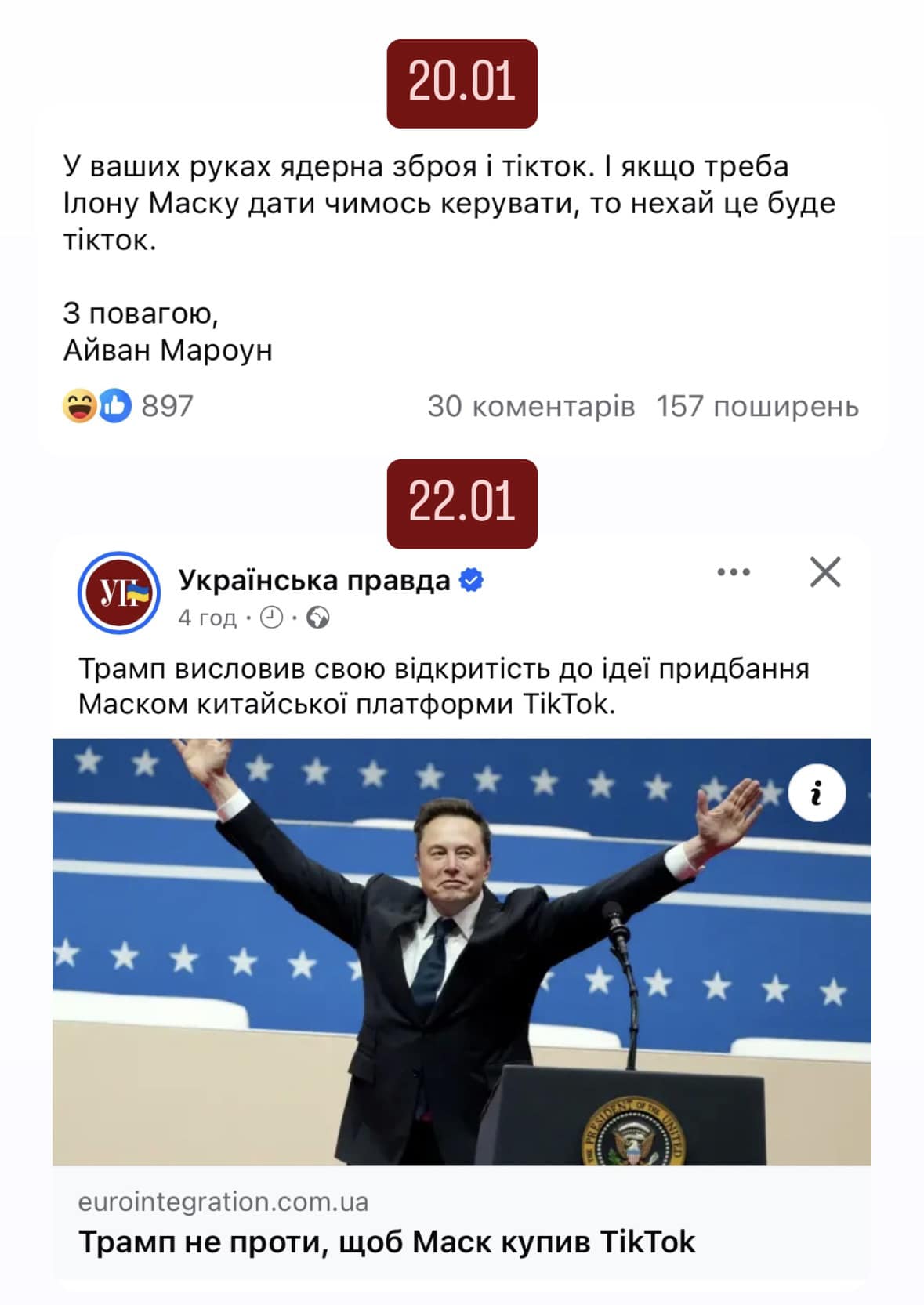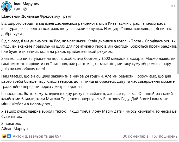 Він опублікував скриншот декількох дописів, що мають різницю в кілька днів. Один з них - попередній допис самого Марунича із жартівливим зверненням до Дональда Трампа у день його інавгурації на посаду президента США: