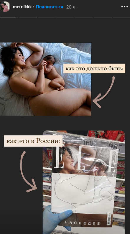 "Це пов'язано з російським законодавством про розміщення повністю оголеного людини на обкладинці. Тобто навіть якщо посил обкладинки - важливий та соціальний, це зчитується як "оголення". Тому ми вирішили не відмовлятися від важливої для нас історії та підтримки материнства, але обіграти її таким елегантним арт-ходом за допомогою "вкладиша", - розповіла Наталія Старостіна "Открытым медиа".