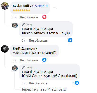 В коментарях під фото користувач Юрій Данильчук написав: "Але старт вже непоганий". Едуард Приступа підтримав цей коментар, вказавши: "Так! Є капітал".