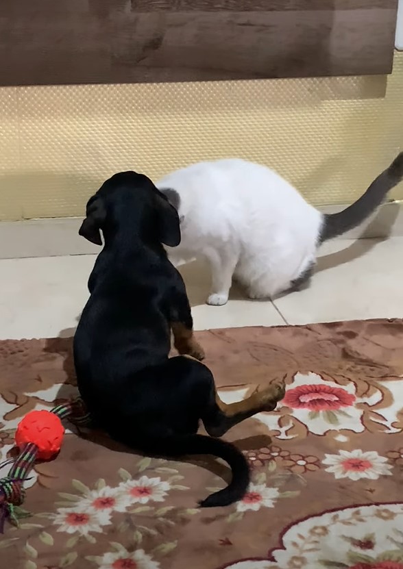 "Цуценя грає з кішкою, кіт б'є його лапою, і той падає у сповільненій зйомці", - йдеться у підписі до забавного ролика. Користувачі в коментарях зазначили, що поведінка цієї парочки їх дуже порадувала. А деякі додали, що на цього пса чекає блискуча кар'єра в акторстві.