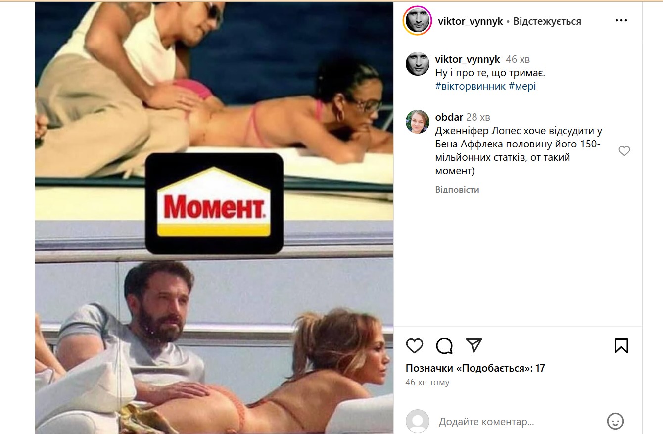Злиті в ЗМІ знамениті фото з голлівудською зіркою Беном Аффлеком та співачкою, актрисою Дженніфер Лопес висміяв український співак, вокаліст рок-гурту "МЕРІ" Віктор Винник.