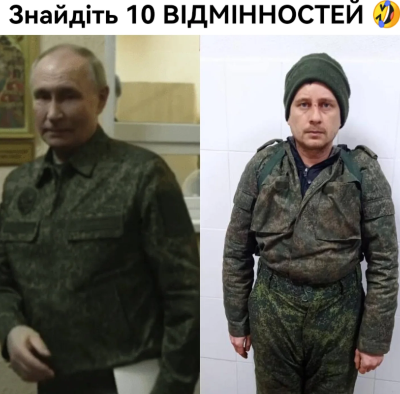 Учасник студії "Квартал 95" пропонує знайти 10 відмінностей між образом кремлівського господаря та російським військовим, що у березні 2022 року став героєм українських інтернет-мемів.