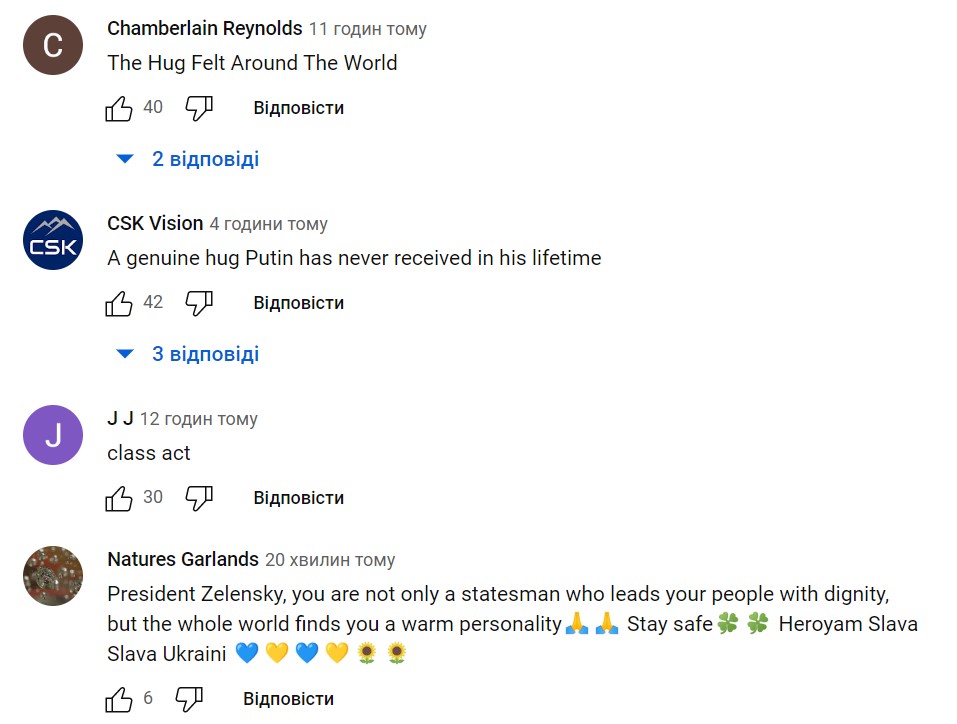 "Обійми, які відчув увесь світ", - пишуть люди. "Щирі обійми, яких Путін ніколи не отримував у своєму житті". "Чудовий вчинок".