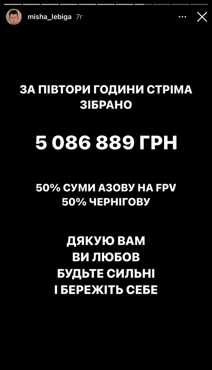 "6 млн грн за півтори години !!! Ми зібрали вчора на благодійному стрімі. А ще з нами в онлайні були 57 тисяч людей – це ж цілий стадіон, уявіть! Пишаємося вами та дякуємо всім!" - йдеться у публікації співачки.