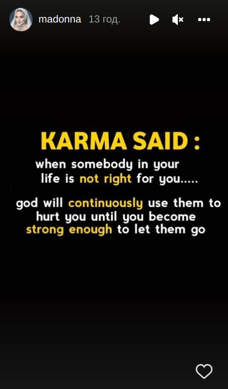 Instagram Мадонна опублікувала загадкове послання. У ньому говориться: "Коли у твоєму житті є людина, яка тобі не підходить, бог постійно використовуватиме її, щоб зробити тобі боляче. Доти, доки ти не станеш достатньо сильною, щоб її відпустити".