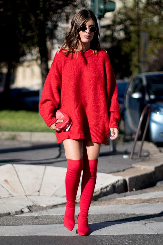 З кольоровими чобітьми також можна скласти total look. Наприклад, червоні ботфорти можна одягти зі светром-сукнею такого ж відтінку. Доповнити образ можна верхнім одягом і сумкою в тон.