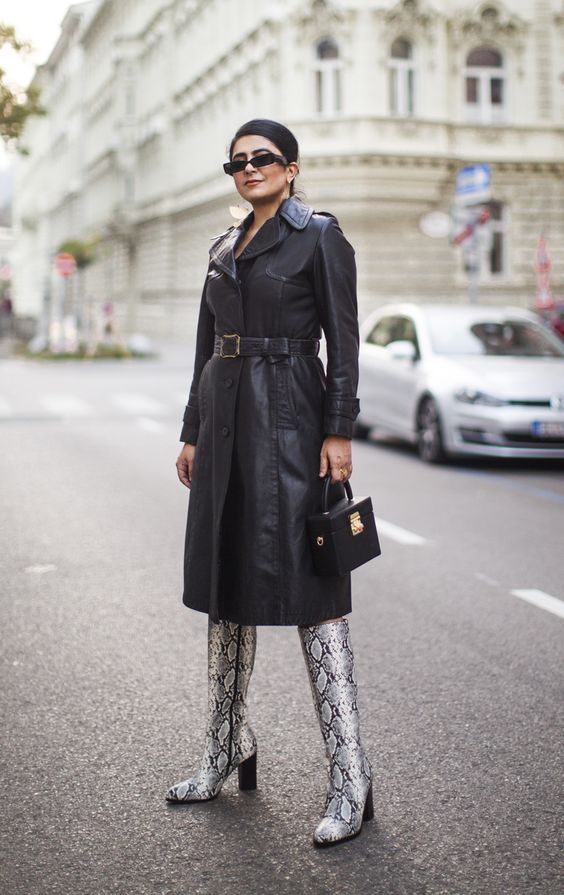 Якщо ви любите одяг зі шкіри або еко-шкіри, ідеально доповнять образ чоботи з імітацією шкіри пітона. Ви можете вибрати аксесуари в тон до взуття або ж скомпонувати total look в одному кольорі, а чоботи стануть яскравим доповненням до луку.
