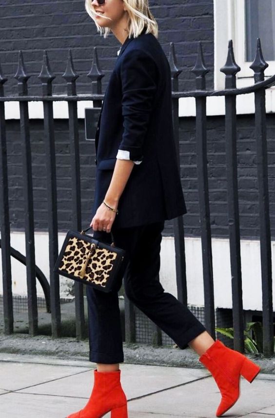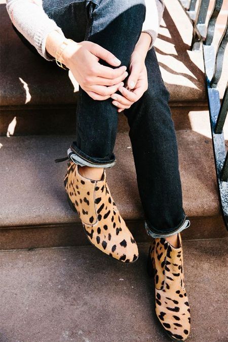 Повсякденний образ, що складається із синіх джинсів та светра, відмінно розбавлять чоботи з леопардовим принтом. Ви можете також доповнити лук аксесуаром такого ж відтінку.