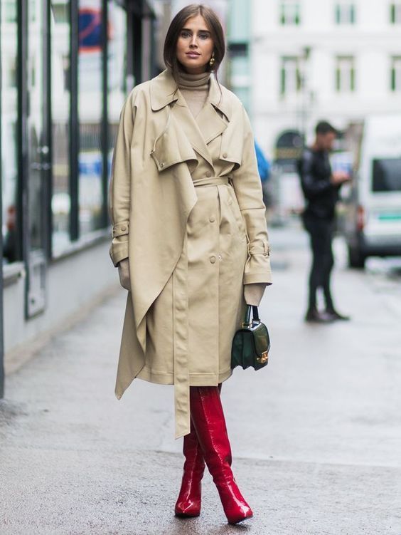 Тим модницям, які люблять завжди виділятися з натовпу, радимо глянути яскраво-червоні чоботи. Вони будуть добре поєднуватися як з бежевим нарядом, так і з чорним, створюючи контраст.