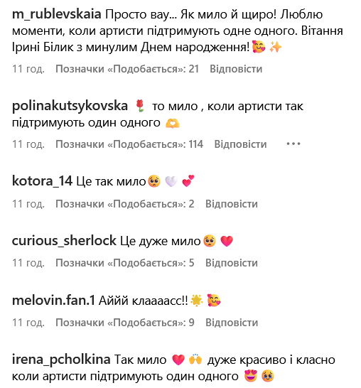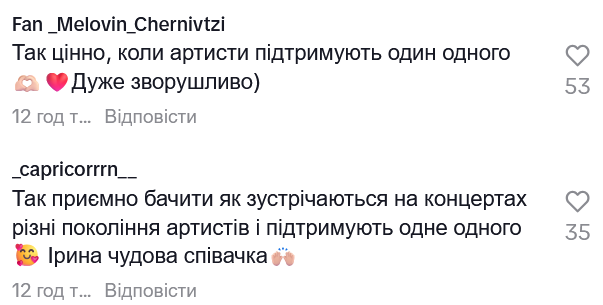 Підписників зворушив цей момент на концерті Ірини Білик. Багато хто написав у коментарях, що приємно бачити, як артисти різних поколінь захоплюються талантом один одного і підтримують на виступах.