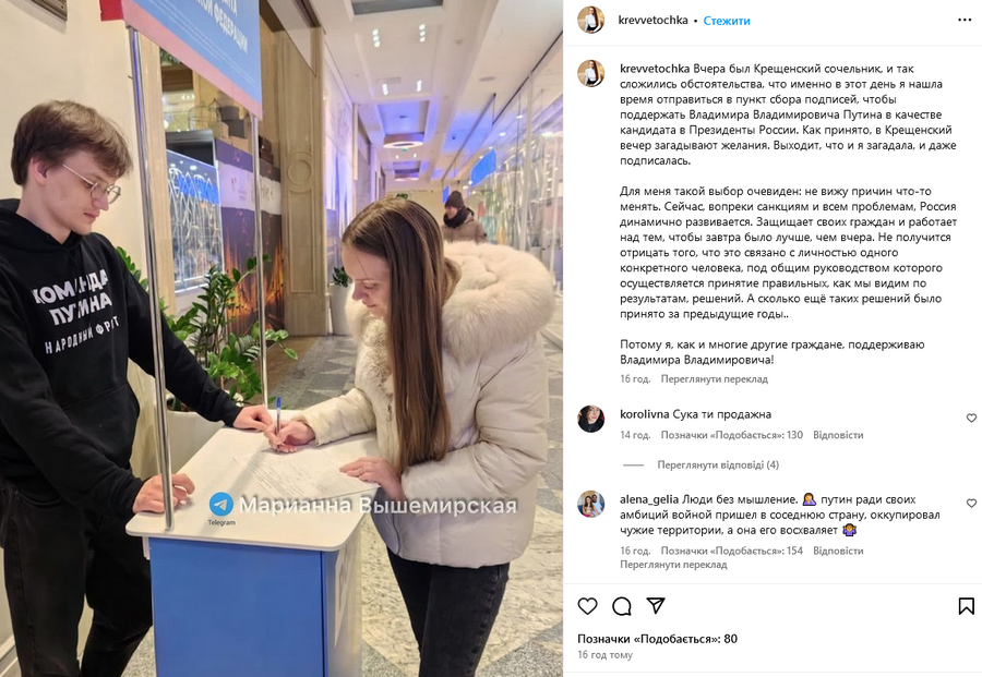 "Вчора був Хрещенський святвечір, і так склалися обставини, що саме в цей день я знайшла час вирушити до пункту збору підписів, щоб підтримати Володимира Володимировича Путіна як кандидата в президенти Росії. Як прийнято, у Хрещенський вечір загадують бажання. Виходить, що і я загадала, і навіть підписалася", - написала Вишемирська в Instagram 19 січня.