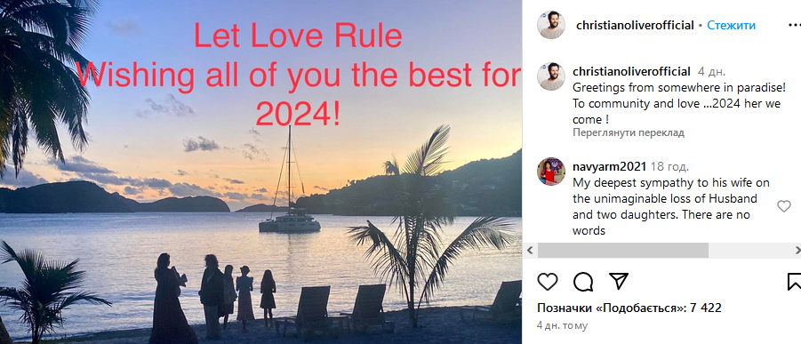 За кілька днів до трагедії Крістіан розмістив в Instagram "пророчий" допис. Актор опублікував фото пляжного пейзажу і написав: "Привіт звідкись з Раю. За спільноту і любов... 2024, ми йдемо".