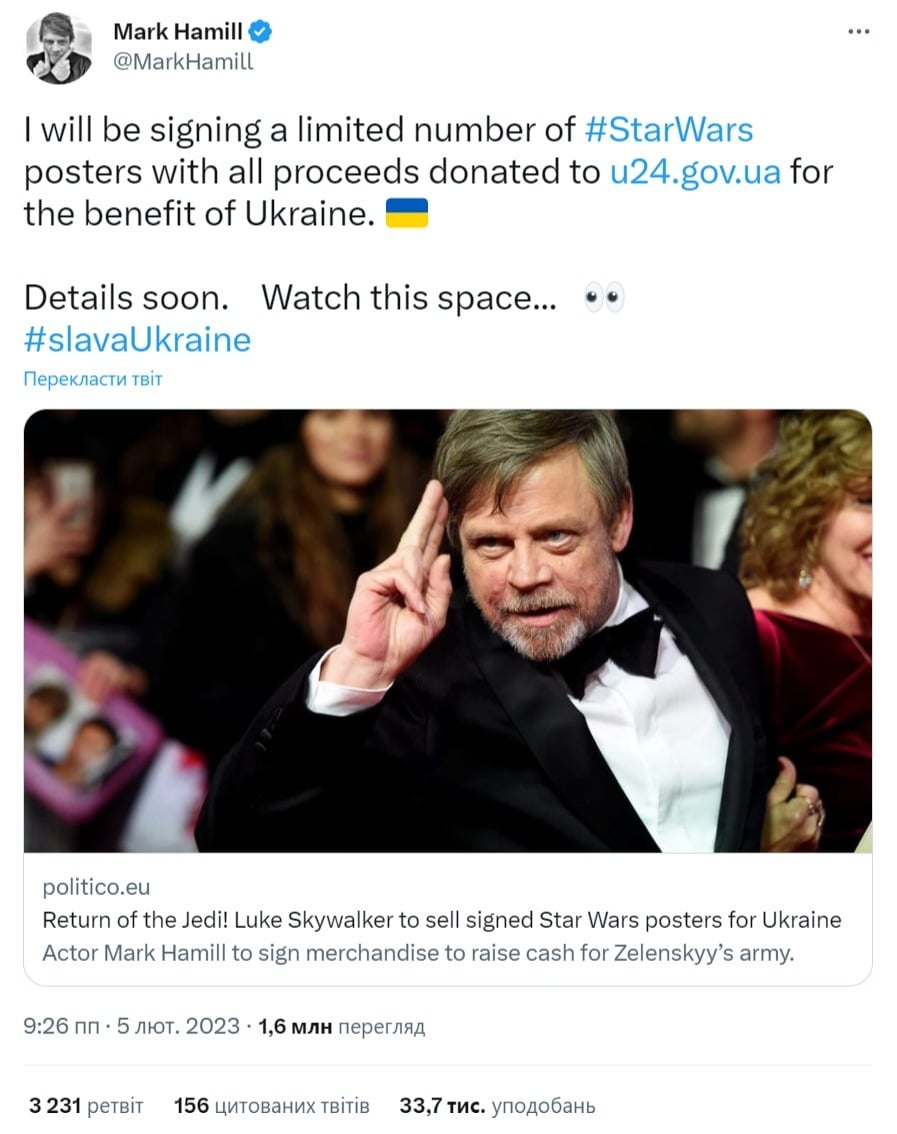 "Я підпишу обмежену кількість постерів "Зоряних війн", а всі виручені кошти переведу на благо України", - написав він у Twitter.