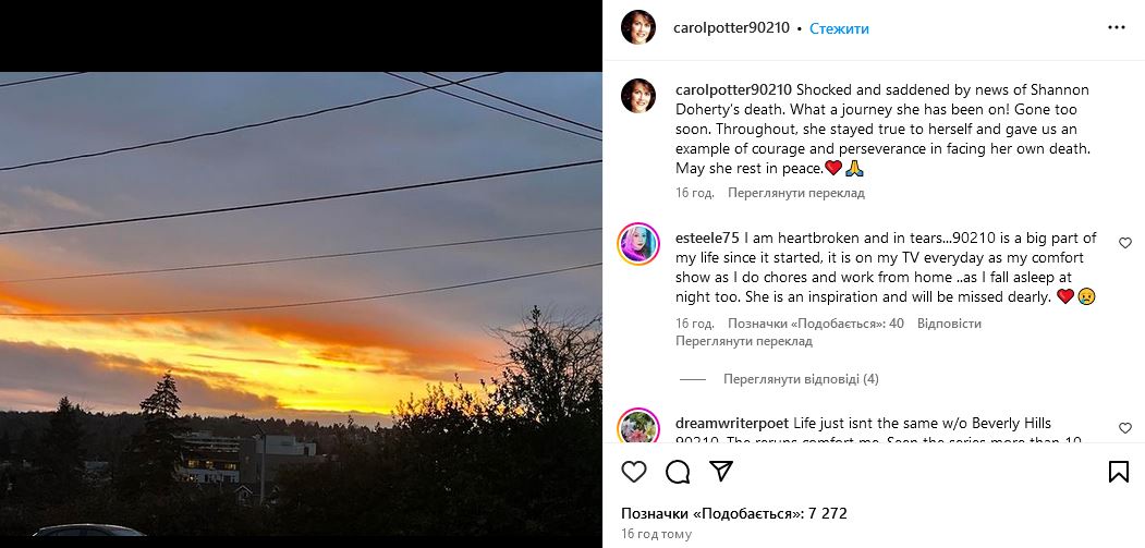 "Ми вражені і засмучені новиною про смерть Шеннон Догерті. Який шлях вона пройшла! Вона пішла занадто рано. Протягом усього шляху вона залишалася вірною собі і дала нам приклад мужності та стійкості перед обличчям власної смерті. Нехай вона спочиває з миром", - написала акторка.