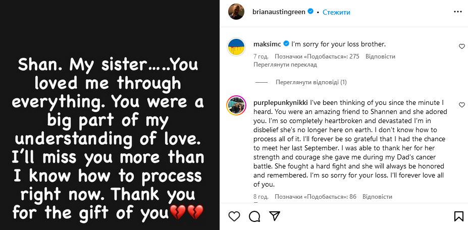 "Шен. Моя сестра... Ти любила мене у всьому. Ти зіграла велику роль у моєму розумінні любові. Мені не вистачатиме тебе більше, ніж я можу зараз уявити. Дякую за те, що подарувала мені тебе!", - зворушливо звернувся до покійної подруги актор.
