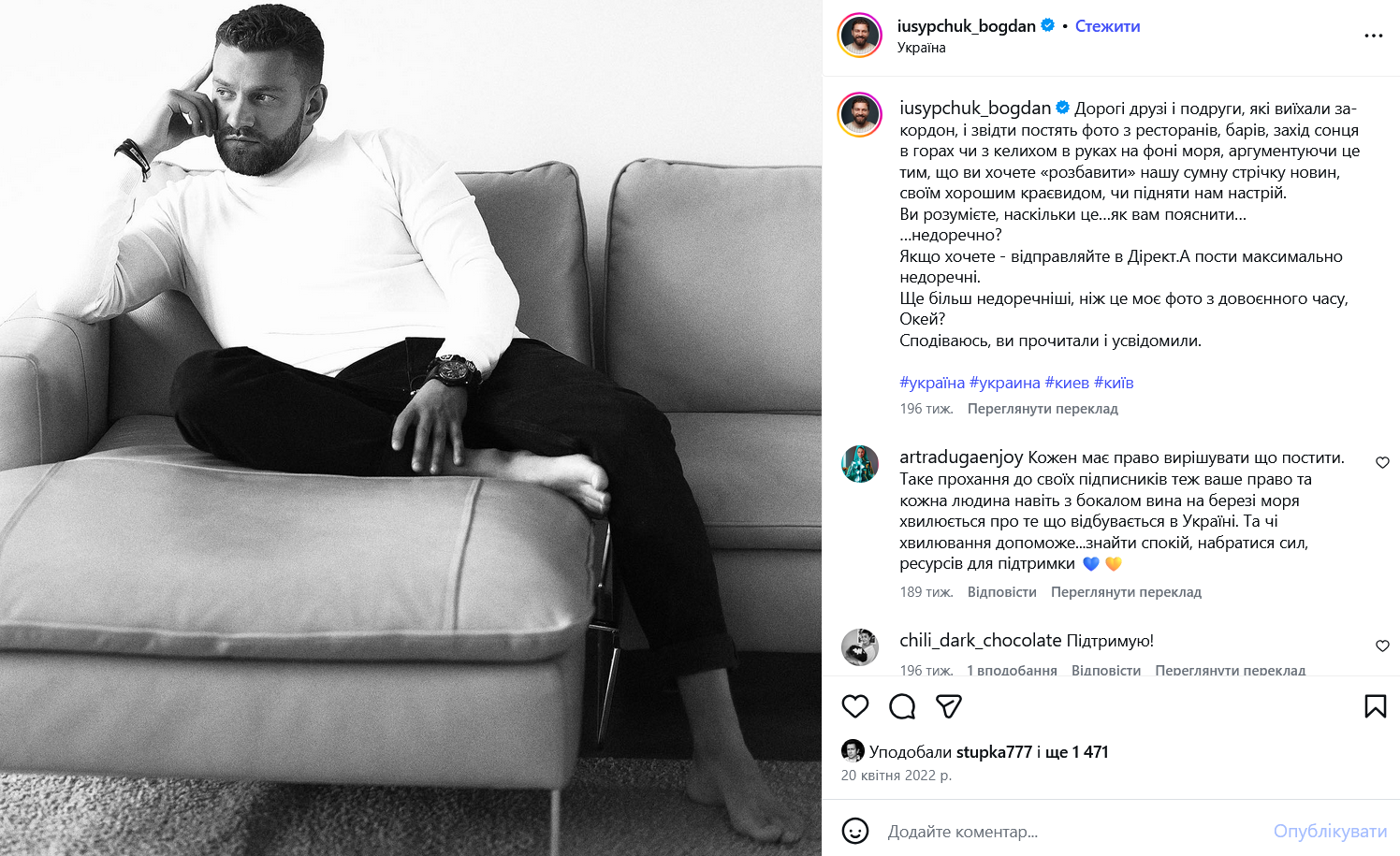 У квітні 2022-го шоумен виклав емоційний допис, у якому засудив українців, які виїхали за кордон і звідти публікують світлини свого мирного безтурботного життя.
