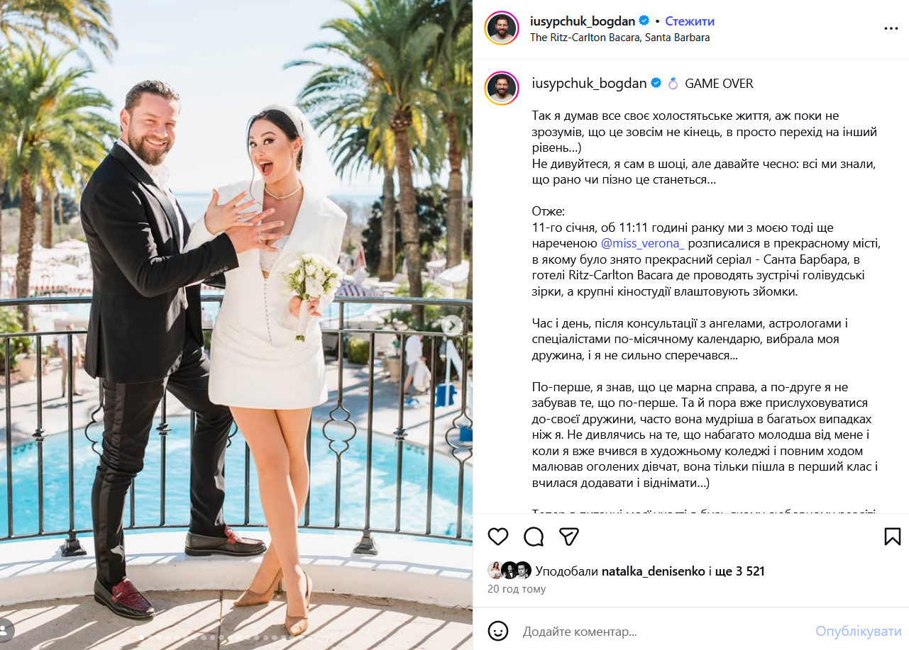 Про зміни в особистому житті Юсипчук повідомив на своїй сторінці в Instagram. Він опублікував яскраві світлини зі свята та розповів, що розпис відбувся в елітному готелі в Санта-Барбарі, де проводять зустрічі голлівудські зірки та влаштовують зйомки великі кіностудії.