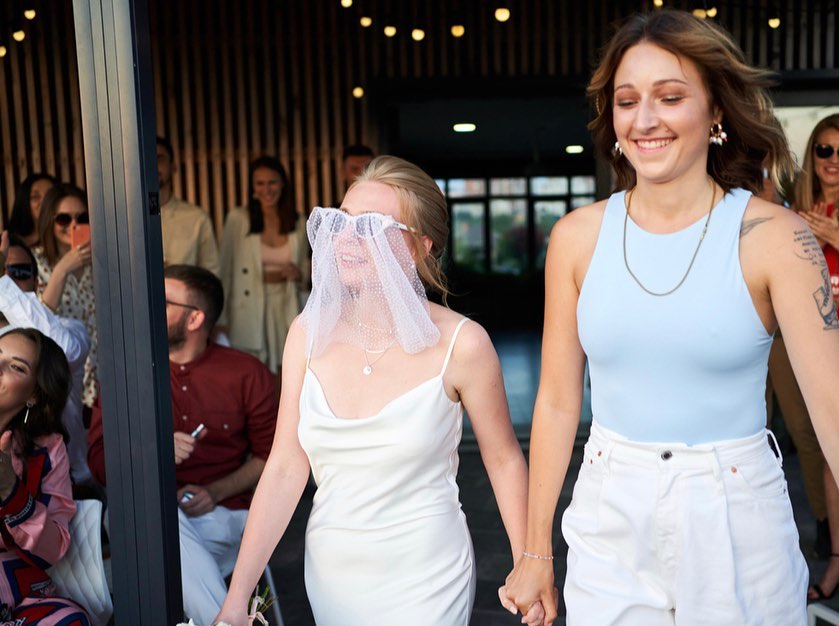 Наречена вибрала для церемонії шовкову сукню в білизняному стилі, яку доповнила човниками-хамелеонами і фатою-окулярами. Наречений вбрався в укорочені брюки і білу сорочку.