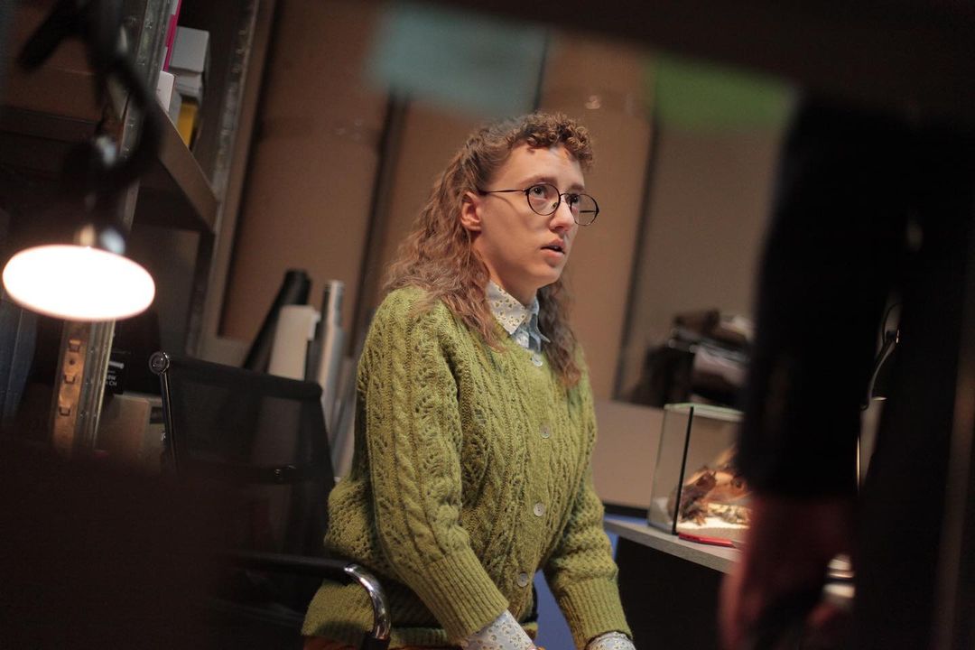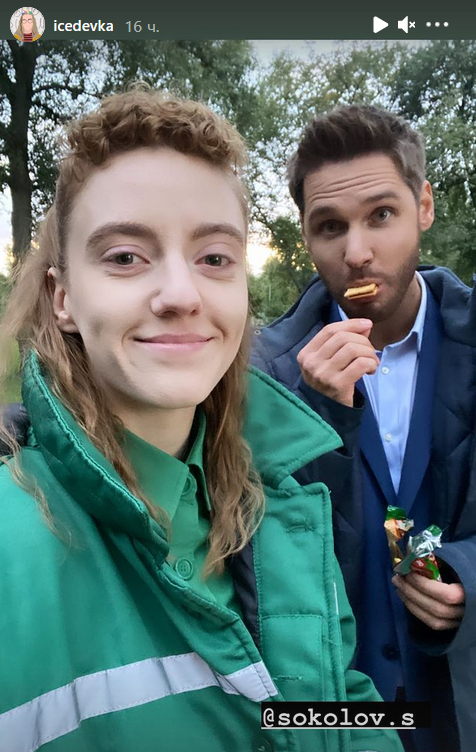 Кадр зі зйомок акторка опублікувала у себе в "сторіз". На ньому Ірина позує з актором Олександром Соколовим, який втілив на екрані роль її боса. І хоча на знімку Поплавська зображена з зачіскою Насті Глушко, розгледіти її зовнішність поза фільмом вже можна.
