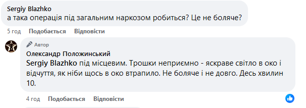 У коментарях Олександр розповів, що лікарі замінили йому два кришталики ока. Хірургічна процедура, за словами Положинського, була безболісною, проходила під місцевим наркозом і тривала близько десяти хвилин.