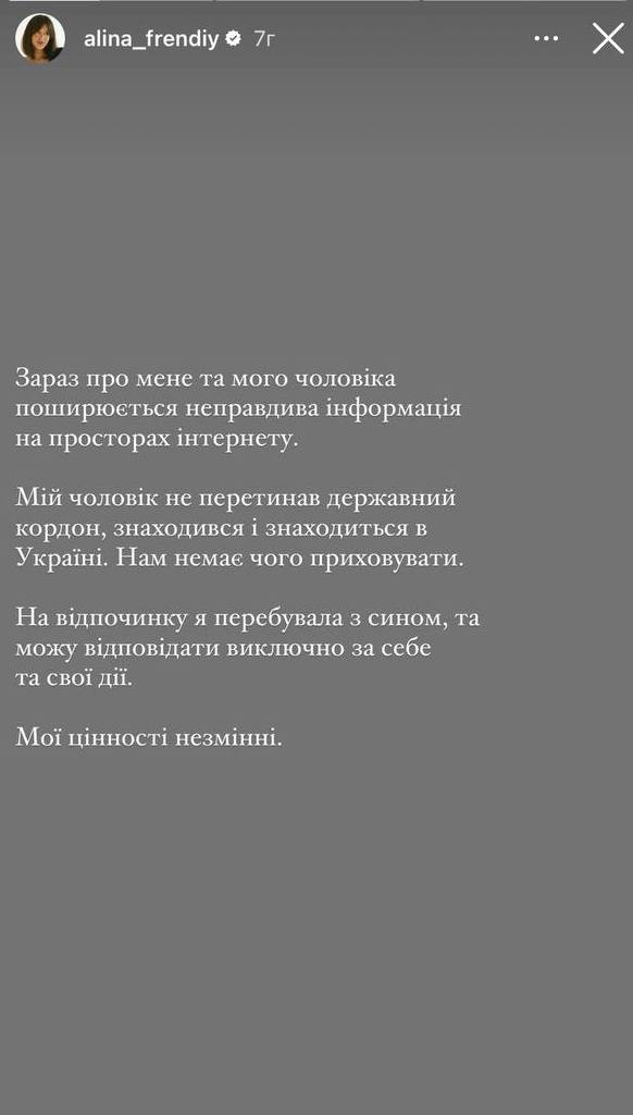 "Зараз про мене та про мого чоловіка поширюється неправдива інформація на просторах інтернету. Мій чоловік не перетинав державний кордон, знаходився і знаходиться в Україні. Нам немає чого приховувати. На відпочинку я перебувала з сином, і можу відповідати виключно за себе та свої дії", - висловилася Аліна Френдій в Instagram-історіях.