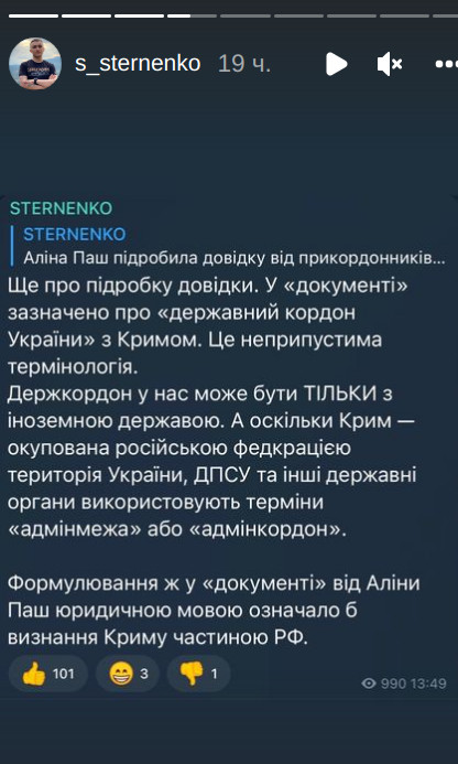 Переможницю Нацвідбору на "Євробачення-2022" Аліну Паш звинуватили у підробці довідки від прикордонників про відвідання Криму у 2015 році. Активіст Сергій Стерненко з посиланням на джерела у Державній прикордонній службі України заявив, що 11 серпня 2015 року співачка вилетіла з України рейсом "Київ-Москва", а повернулася 14 серпня з аеропорту Домодєдово. У Криму Паш була 12 серпня і Стерненко стверджує, що потрапити туди вона могла тільки з території Росії.