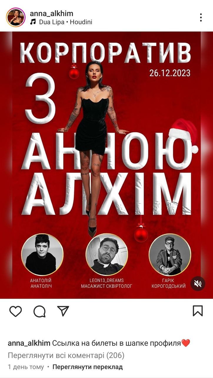 "Аню знаю давно і неодноразово сам "цькував її носом" в її власні зашквари. Я погодився на участь у Алхім з умовою, що вона публічно для пʼятисот своїх гостей і мільйонів підписників відправить на х*й Асті та скаже, що "Слово пацана" дивляться довбо*оби. Я із задоволенням скористаюсь можливістю донести подібні меседжі для великої аудиторії Анни Алхім. Події веду тільки українською. Але головне - що це не "корпоратив", а назва форуму для підписників. Дискотеки та пияцтва там не буде. На цьому форумі я проведу великий збір на допомогу ЗСУ", - йшлося у коментарі знаменитості.
