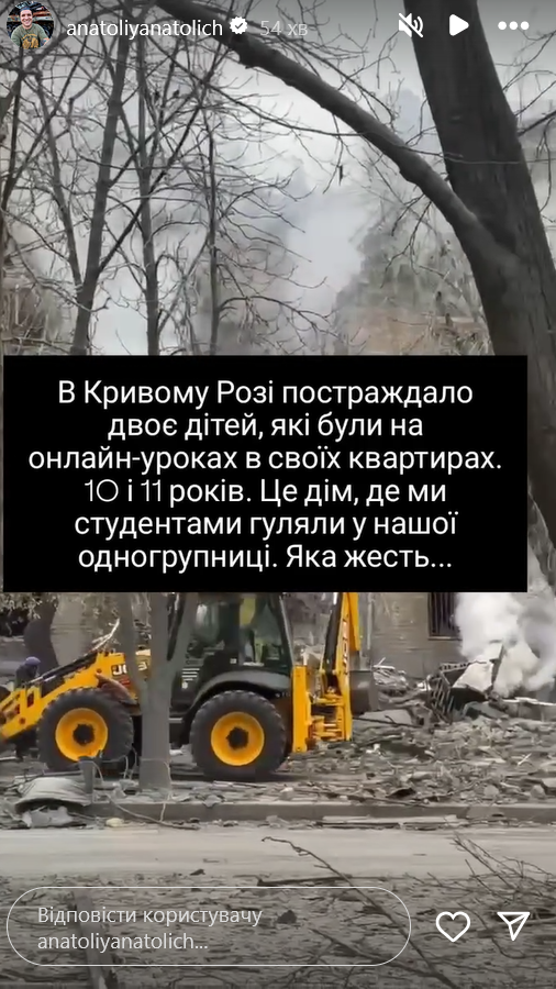 "У Кривому Розі постраждало двоє дітей, які були на онлайн-уроках у своїх квартирах. 10 і 11 років. Це дім, де ми студентами гуляли у нашої одногрупниці. Яка жесть...", - додав батько трьох дітей.