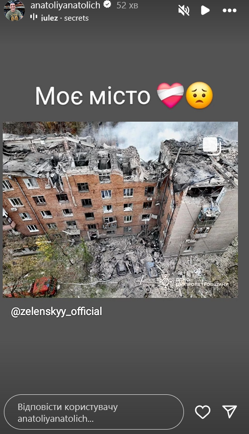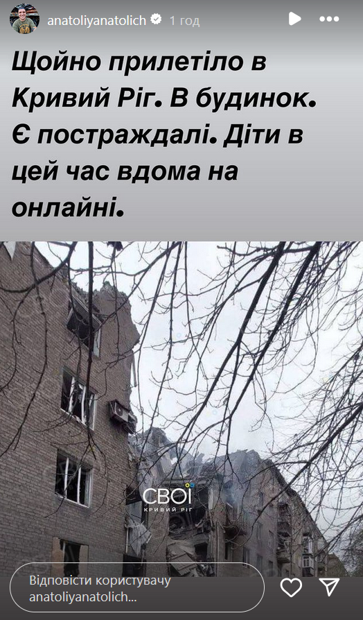 Анатолій Анатоліч родом із Кривого Рогу, по якому Росія вдарила ракетою вранці 11 листопада. Внаслідок ворожої атаки був пошкоджений п'ятиповерховий житловий будинок. Телеведучий відреагував на ракетний удар по його рідному місту і розповів про п'ятиповерхівку, в якій постраждали люди, серед яких діти.